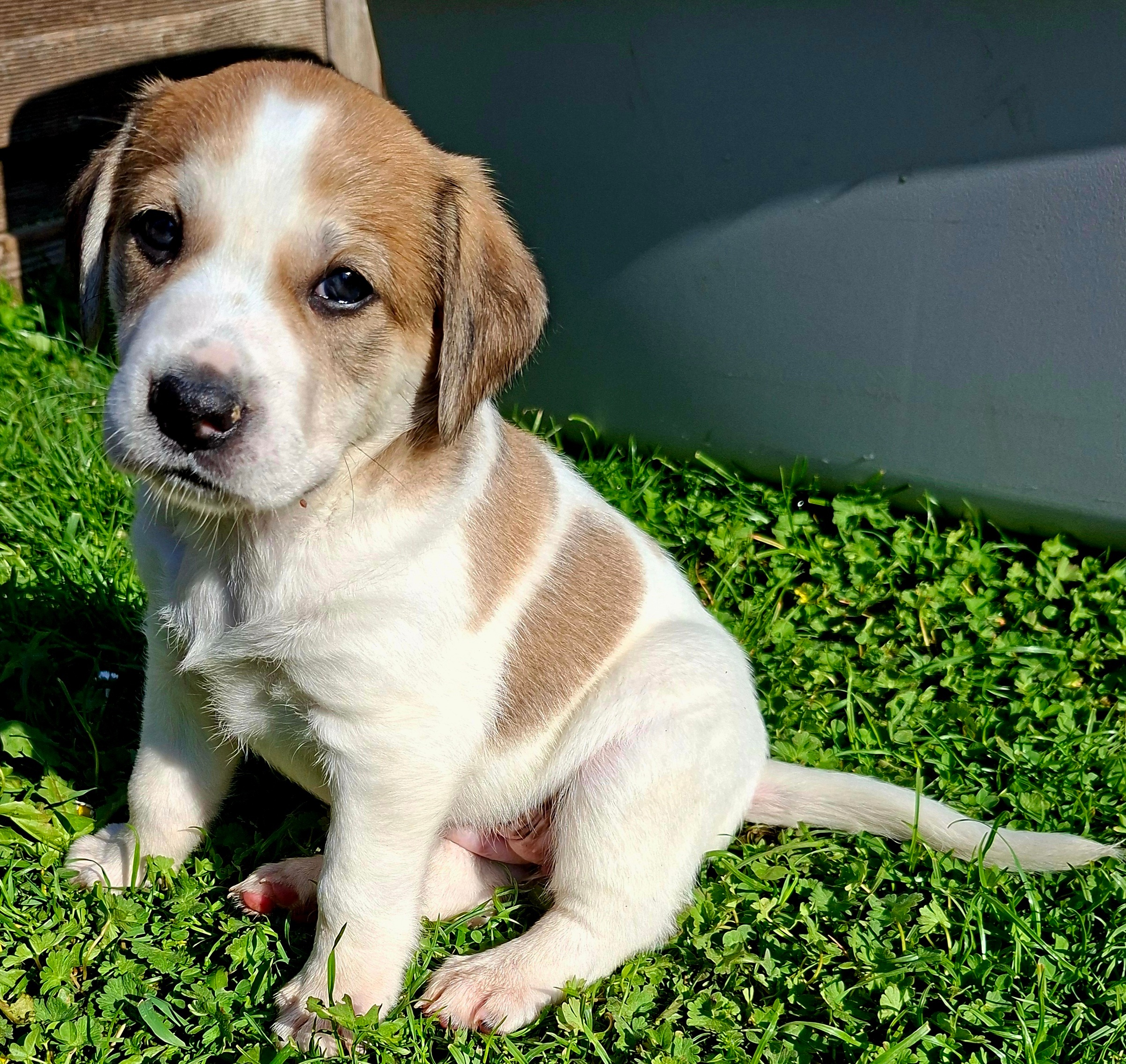 Die Elterntiere (Mutter 2 Jahre alt, orange – Vater 1 Jahr alt, schwarz-weiß) sind sehr freundliche Familienhunde und leben bei uns im Haushalt. Beides sind Mischlinge mit einem Gewicht von jeweils gut 20kg und einer Schulterhöhe von jeweils etwas über 50cm.